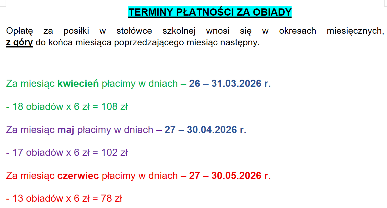 BRAK WPŁATY ZA OBIADY BĘDZIE SKUTKOWAĆ NIEWYDANIEM DZIECKU POSIŁKU !!!