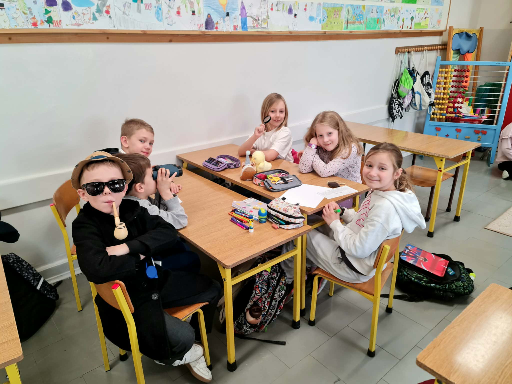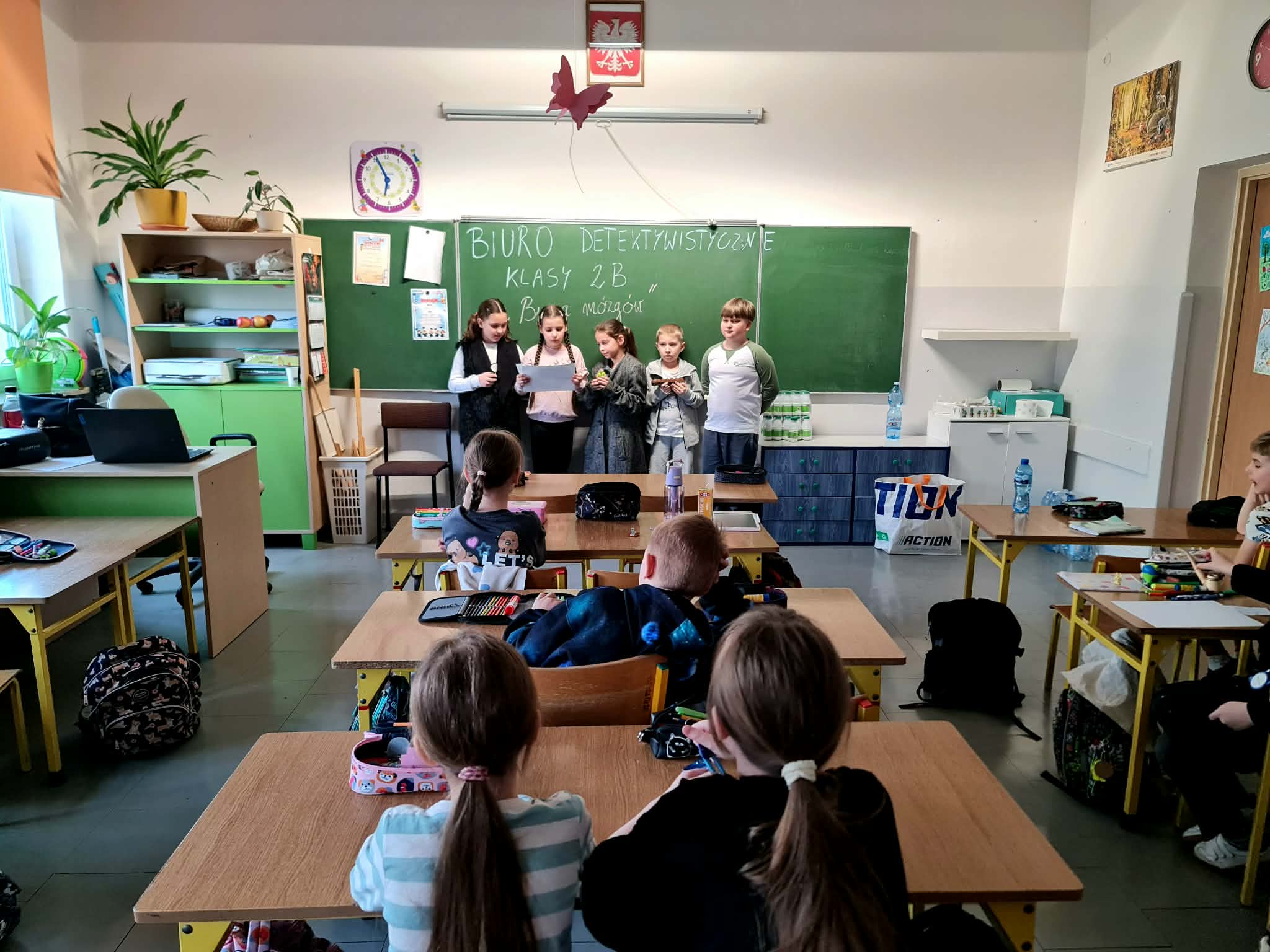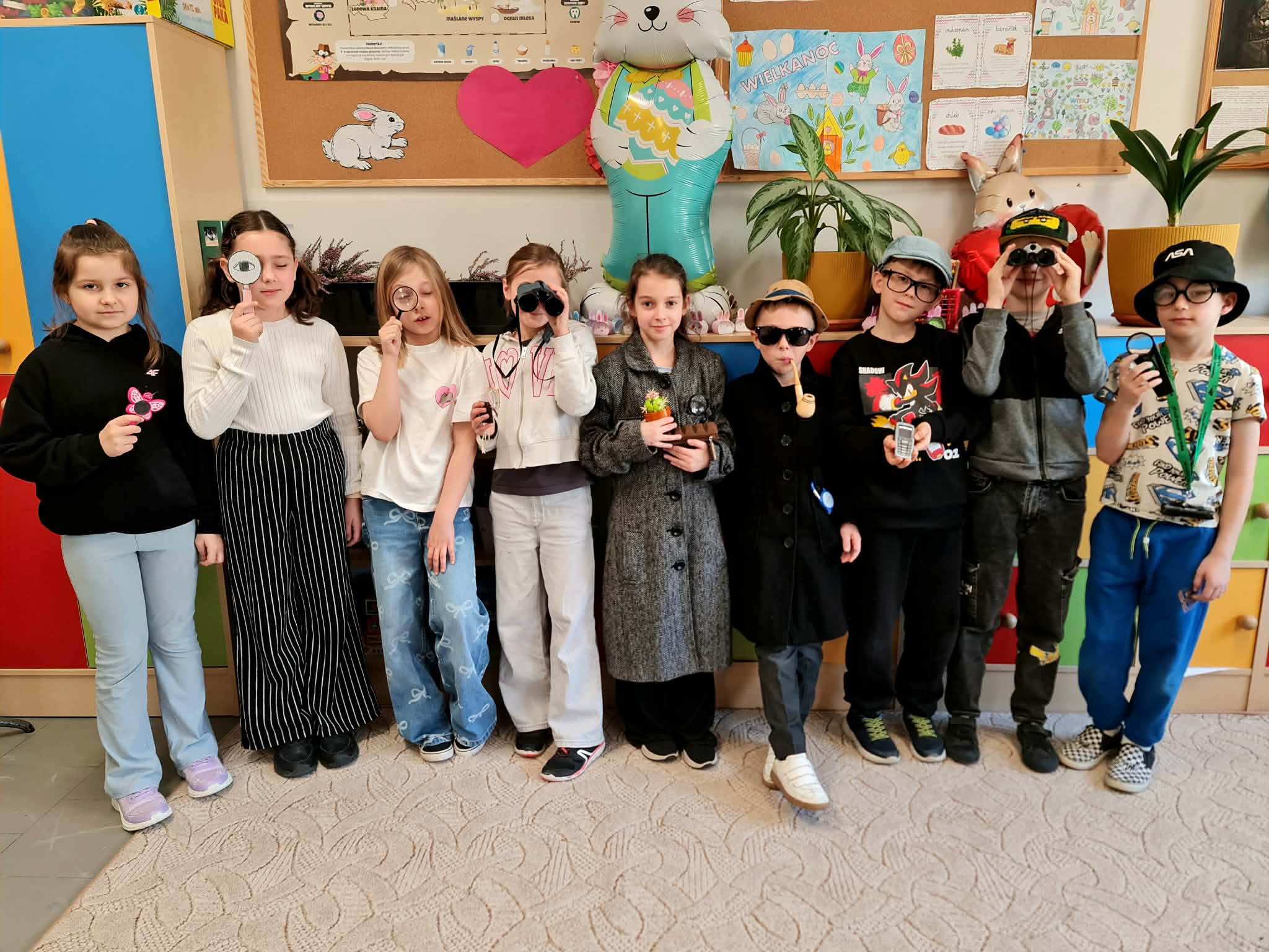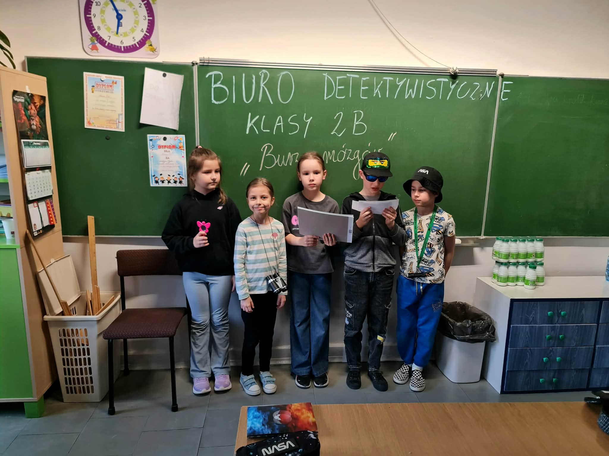 Pod koniec marca, w nawiązaniu do omawianej lektury pt.: „Detektyw Pozytywka”, uczniowie klasy 2b wzięli udział w nietypowych zajęciach. Na początku cała klasa założyła swoją agencję detektywistyczną i wymyśliła dla niej nazwę. Niektórzy chętni uczniowie tak bardzo wczuli się w rolę detektywów, że z okazji tych planowanych tematycznych zajęć przyszli do szkoły w specjalnych przebraniach i przynieśli ze sobą różne detektywistyczne akcesoria. Następnie uczniowie zostali podzieleni na cztery zespoły, których zadaniem było rozwikłanie zagadkowych historii otrzymanych od tajemniczych klientów. Każda grupa z dużym zaangażowaniem analizowała wskazówki i szukała właściwych rozwiązań. Na zakończenie zespoły zaprezentowały swoje pomysły na rozwiązanie powierzonych im spraw. Dzieci świetnie poradziły sobie z zadaniami, wykazując się spostrzegawczością, logicznym myśleniem, kreatywnością oraz umiejętnością współpracy.