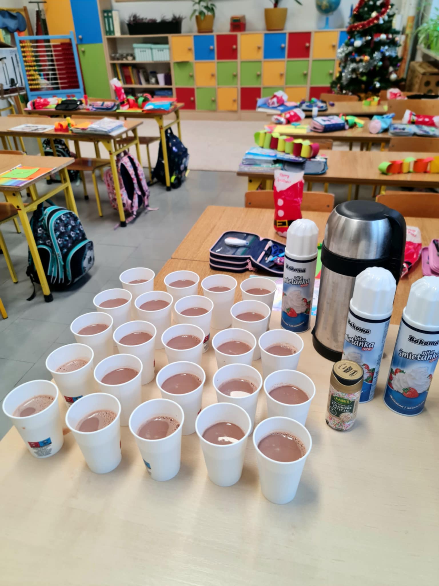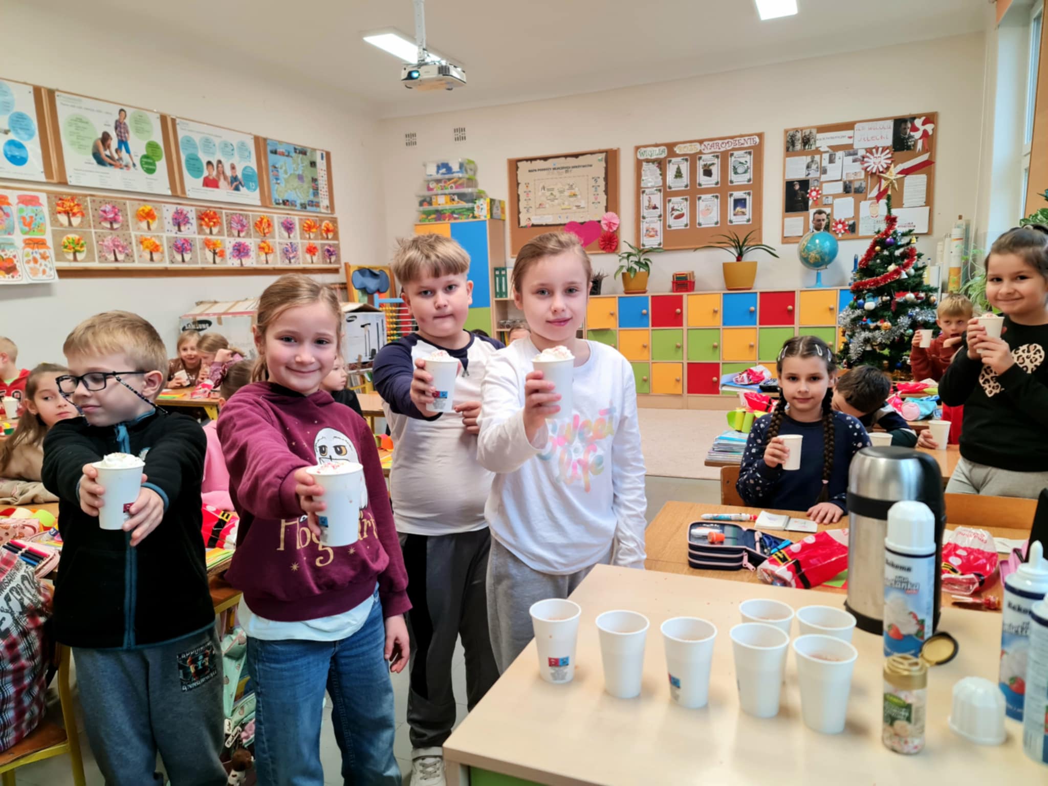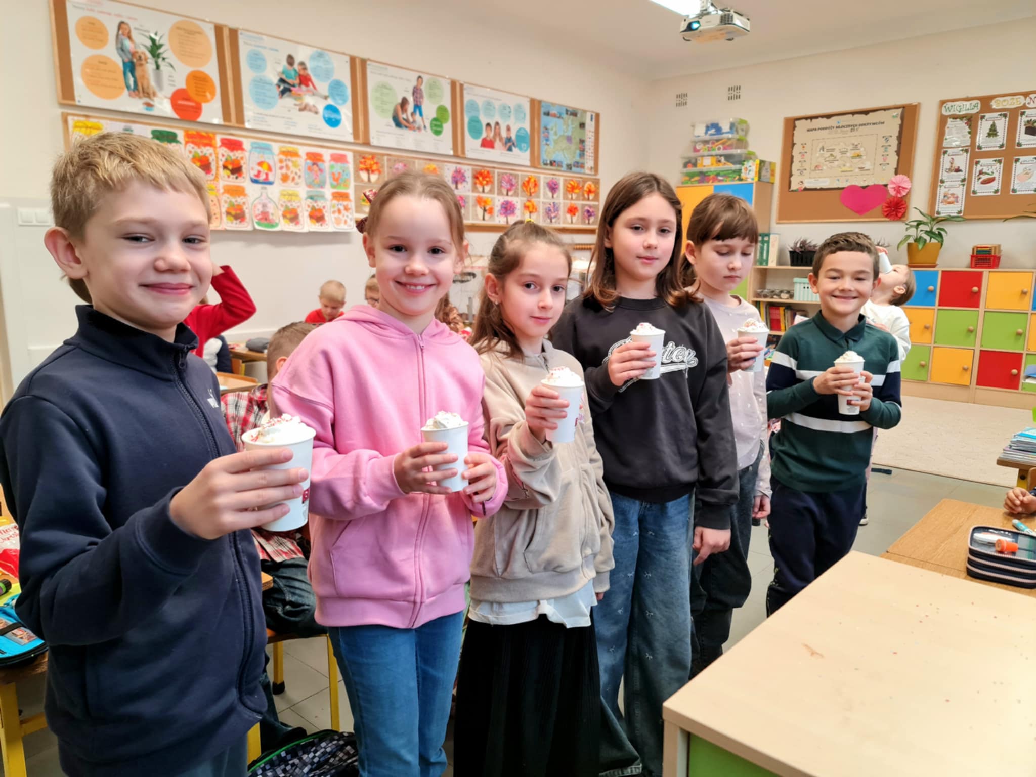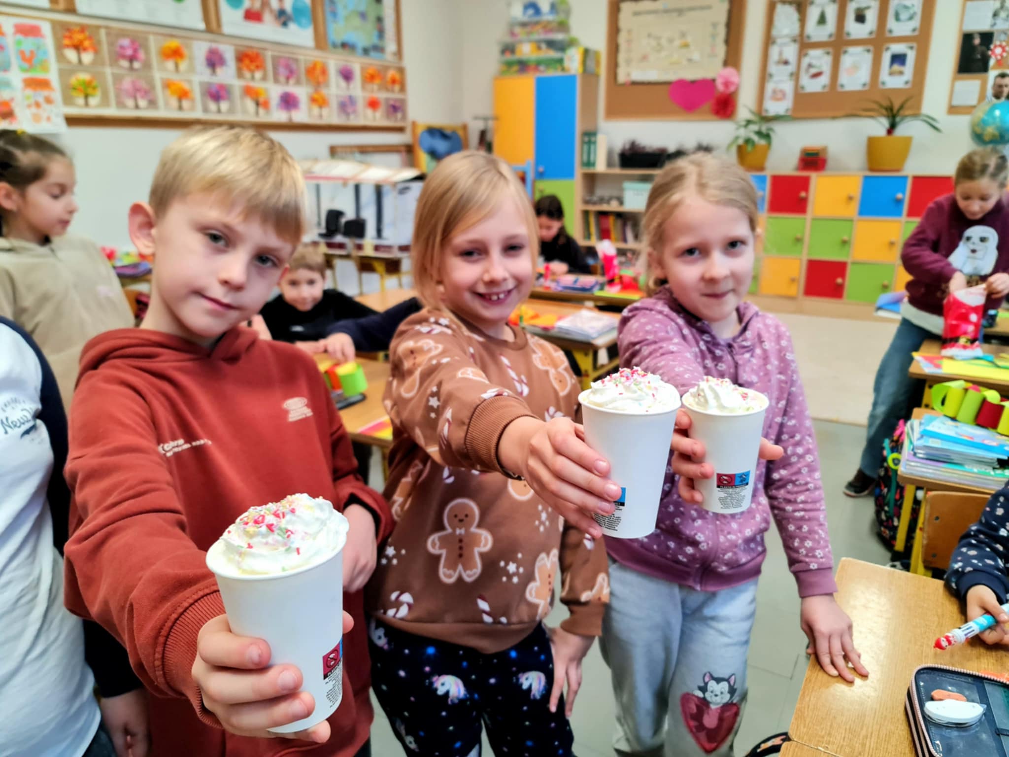 Później uczniowie wspólnie obejrzeli bajkę pt.:„Ekspres polarny”. W pewnym momencie wydarzyło się coś naprawdę wyjątkowego – kiedy dzieci w filmie częstowano gorącą czekoladą podczas podróży na Biegun Północny - w naszej klasie również pojawiła się słodka, pachnąca, gorąca czekolada, przygotowana specjalnie dla klasy 2b. Ten magiczny moment sprawił, że granica między filmem, a rzeczywistością na chwilę zupełnie zniknęła.