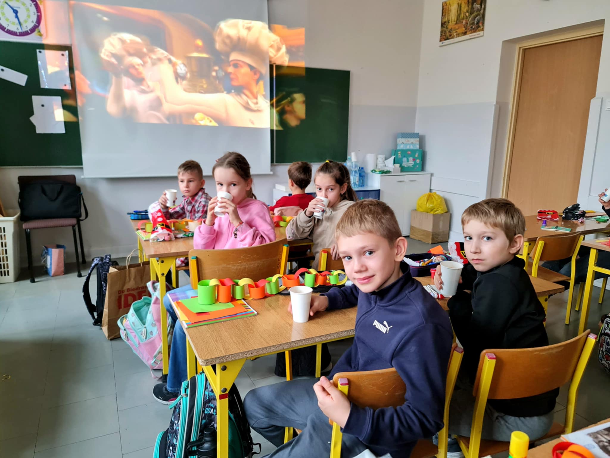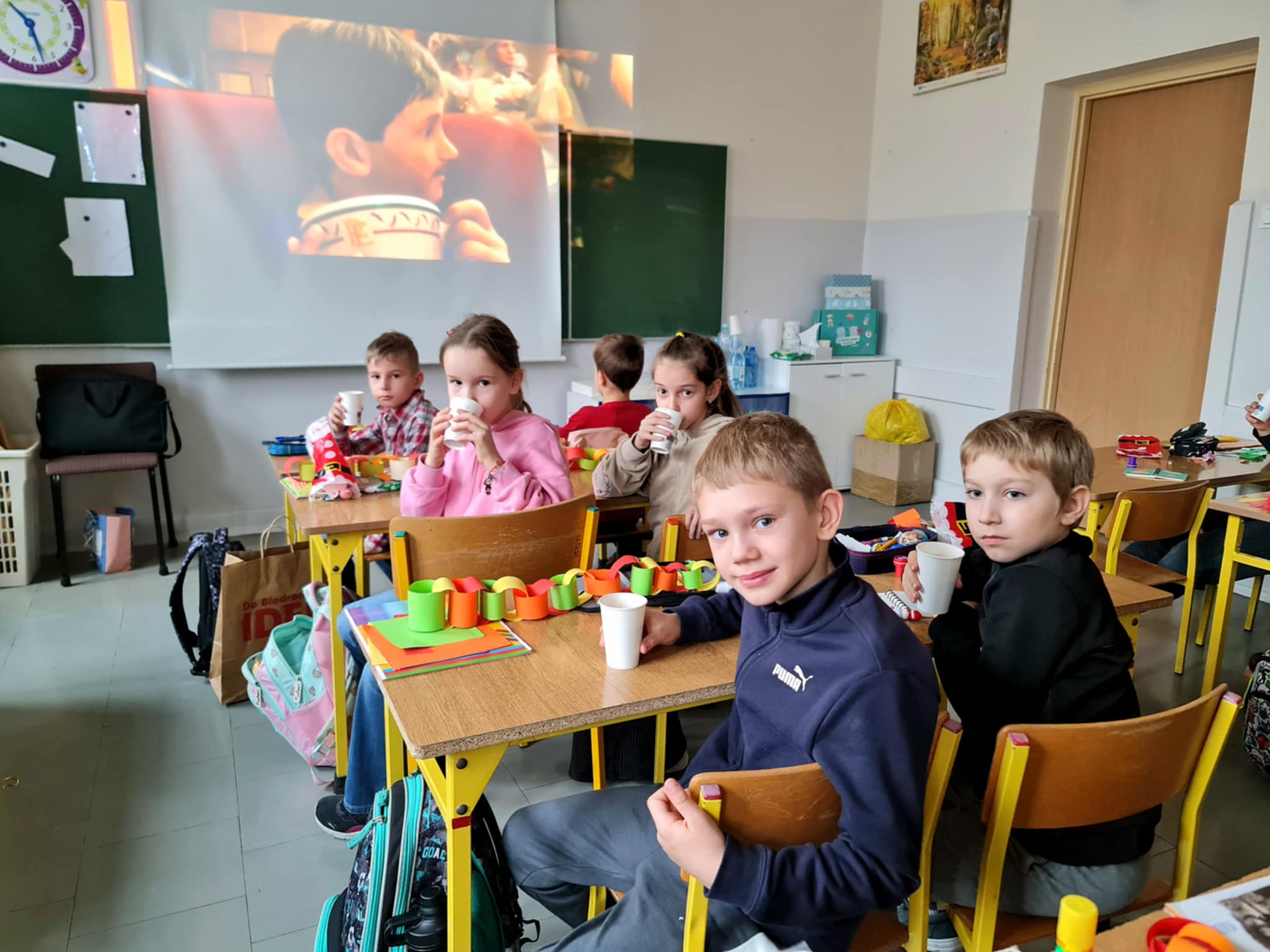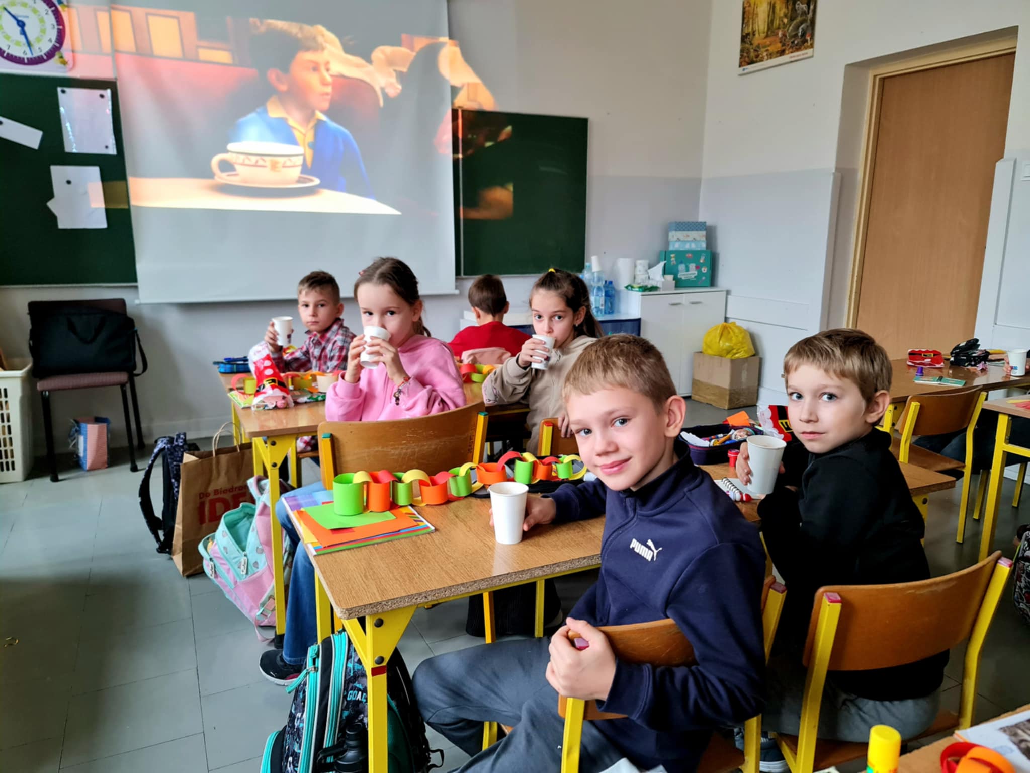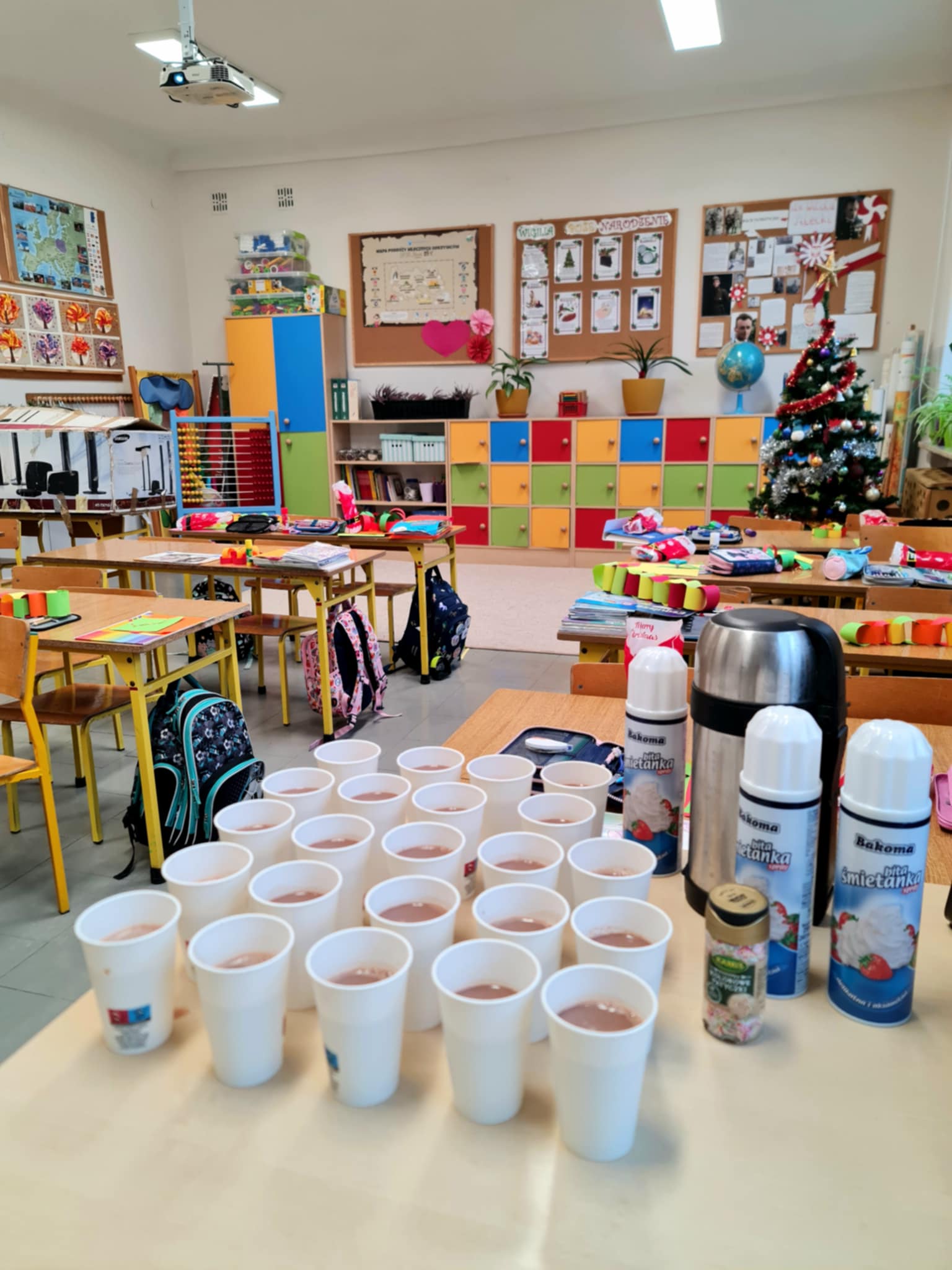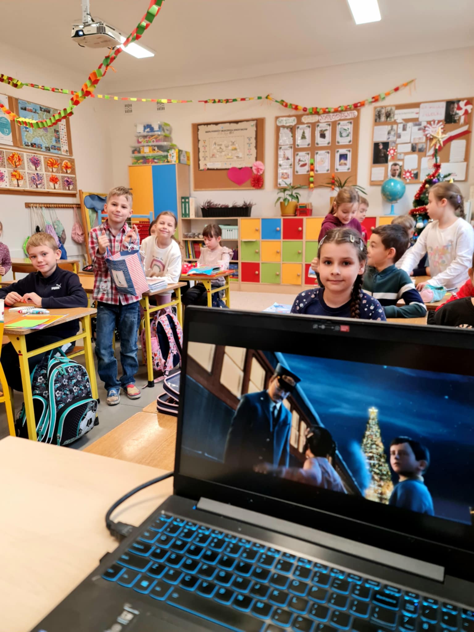 Później uczniowie wspólnie obejrzeli bajkę pt.:„Ekspres polarny”. W pewnym momencie wydarzyło się coś naprawdę wyjątkowego – kiedy dzieci w filmie częstowano gorącą czekoladą podczas podróży na Biegun Północny - w naszej klasie również pojawiła się słodka, pachnąca, gorąca czekolada, przygotowana specjalnie dla klasy 2b. Ten magiczny moment sprawił, że granica między filmem, a rzeczywistością na chwilę zupełnie zniknęła.