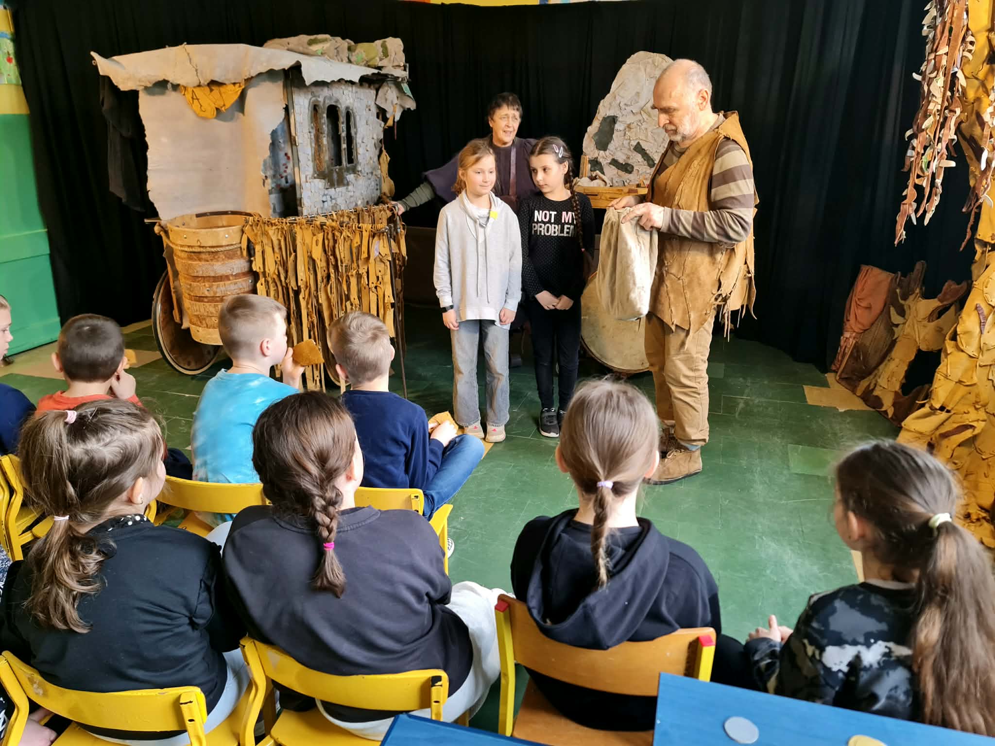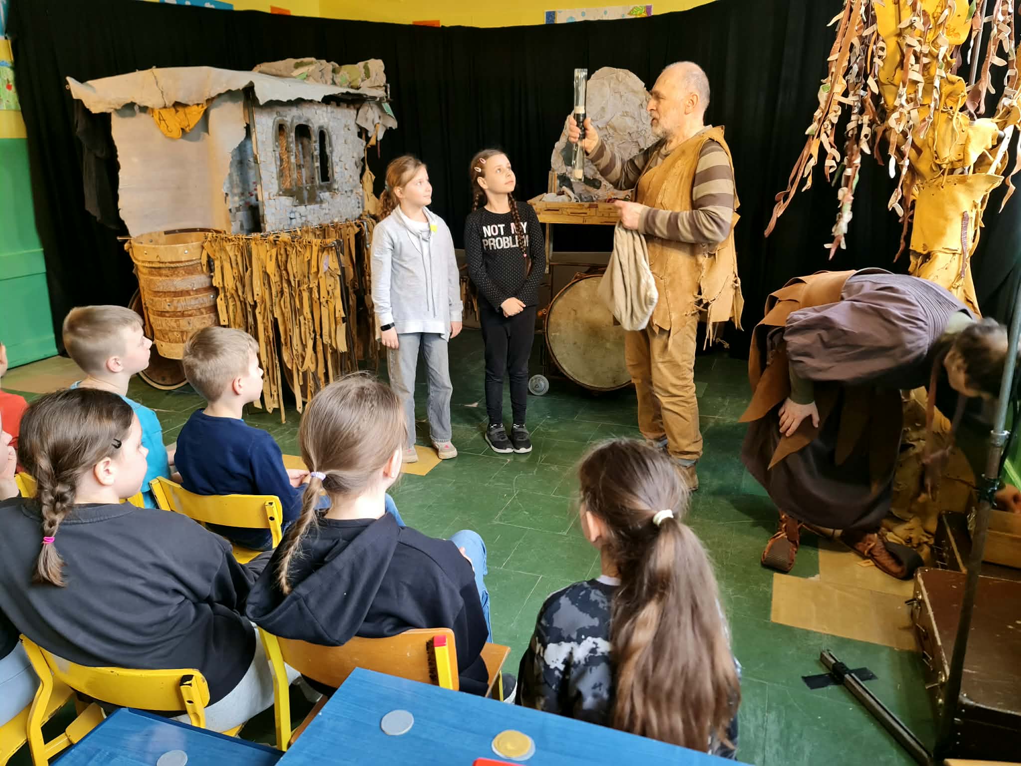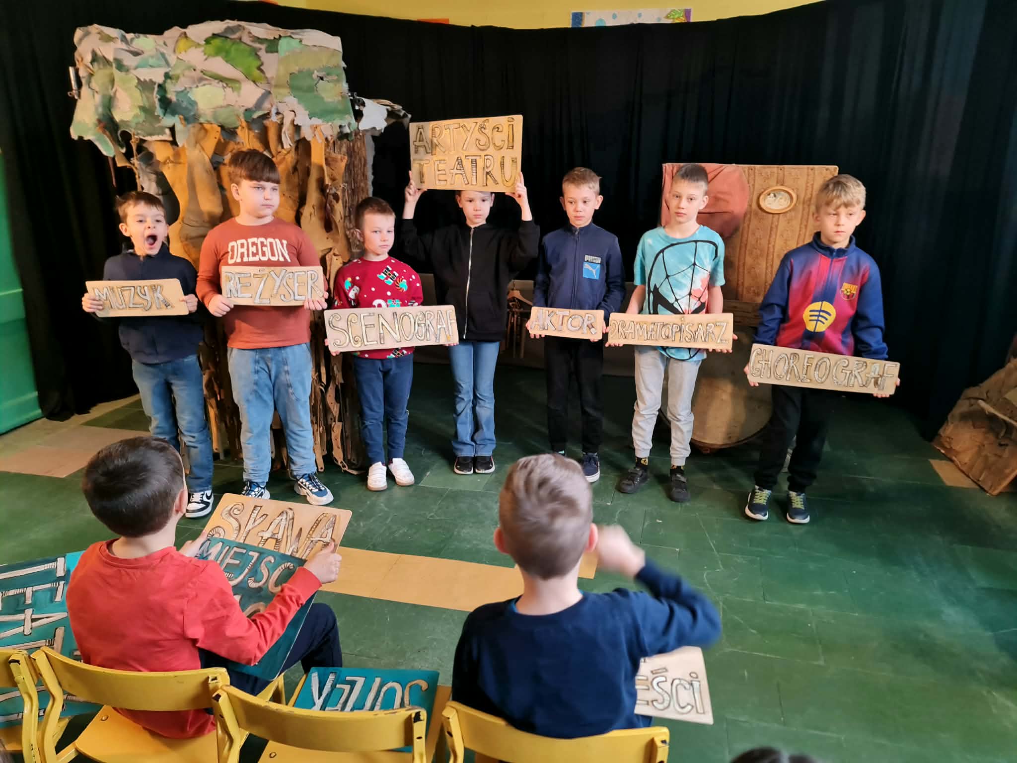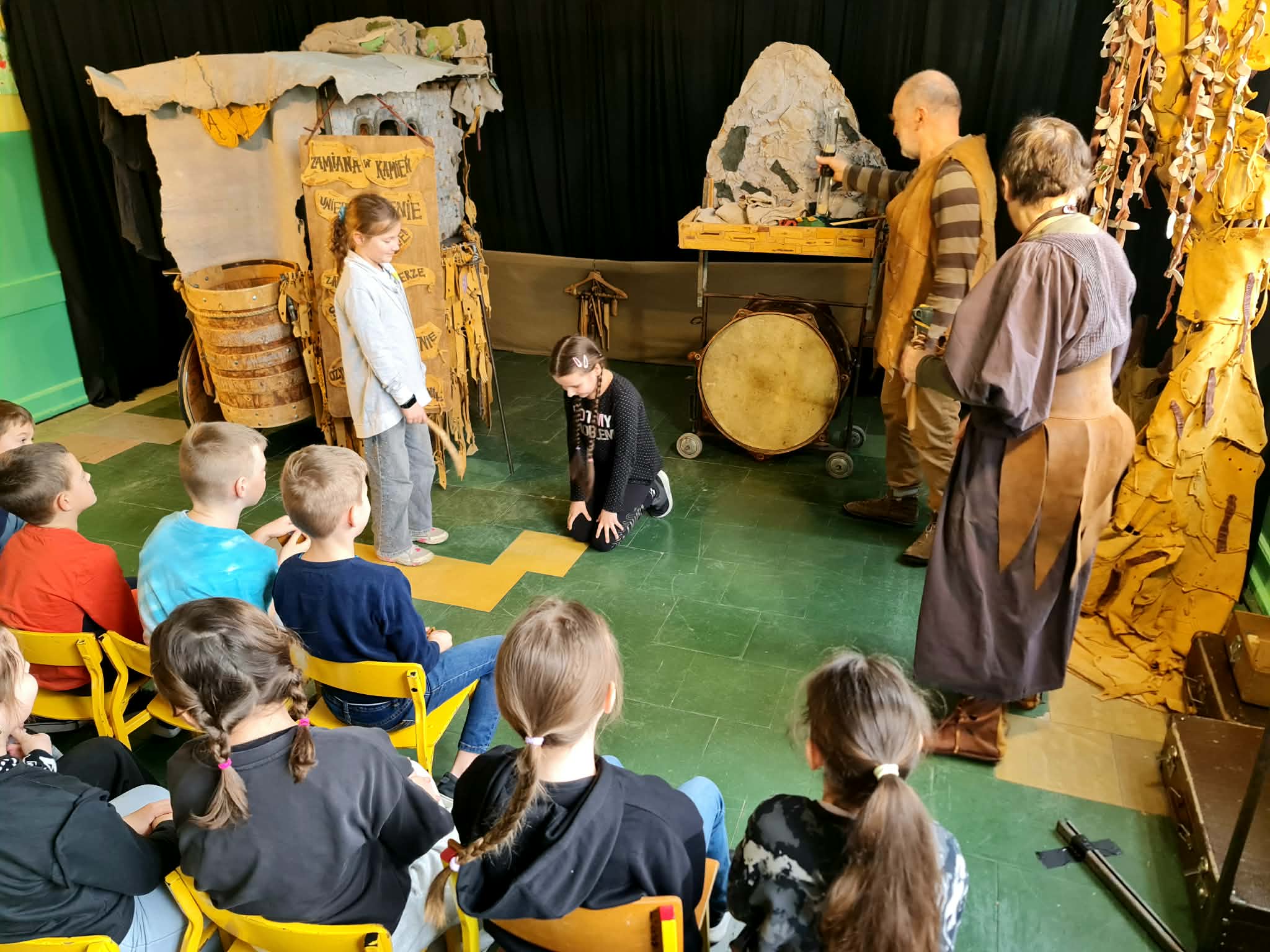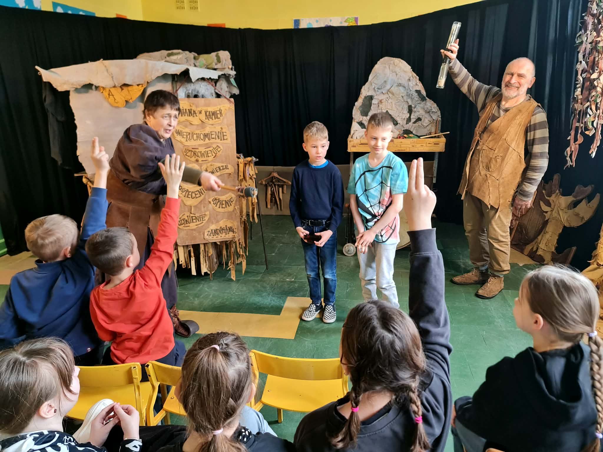 Uczniowie klas 2a, 2b i 2c wzięli udział w ciekawych warsztatach teatralnych pt.: Po co teatr?", które odbyły się na terenie naszej szkoły. Na początku zajęć dzieci dowiedziały się, jak wyglądał handel w dawnych czasach – poznały dawne środki płatnicze oraz dowiedziały się, na czym polegała wymiana towarów, zanim zaczęto powszechnie używać pieniędzy. Podczas warsztatów uczniowie poznali również, jak ważną rolę od wieków odgrywa teatr w życiu ludzi – zarówno widzów, jak i osób pracujących przy tworzeniu spektakli. Dzieci miały okazję dowiedzieć się, czym jest baśń jako gatunek literacki, jakie elementy powinna zawierać oraz dlaczego opowieści i narracja są tak ważne w kulturze. Chętni uczniowie mogli spróbować nie tylko swoich sił w działaniach aktorskich, ale i uczyć się rzucać tajemnicze zaklęcia. W trakcie zajęć dzieci aktywnie uczestniczyły w różnych zadaniach i zabawach teatralnych, wykorzystując liczne rekwizyty. Ich zaangażowanie i zdobywane umiejętności były nagradzane specjalnymi talarami, które dodatkowo motywowały do działania i współpracy.