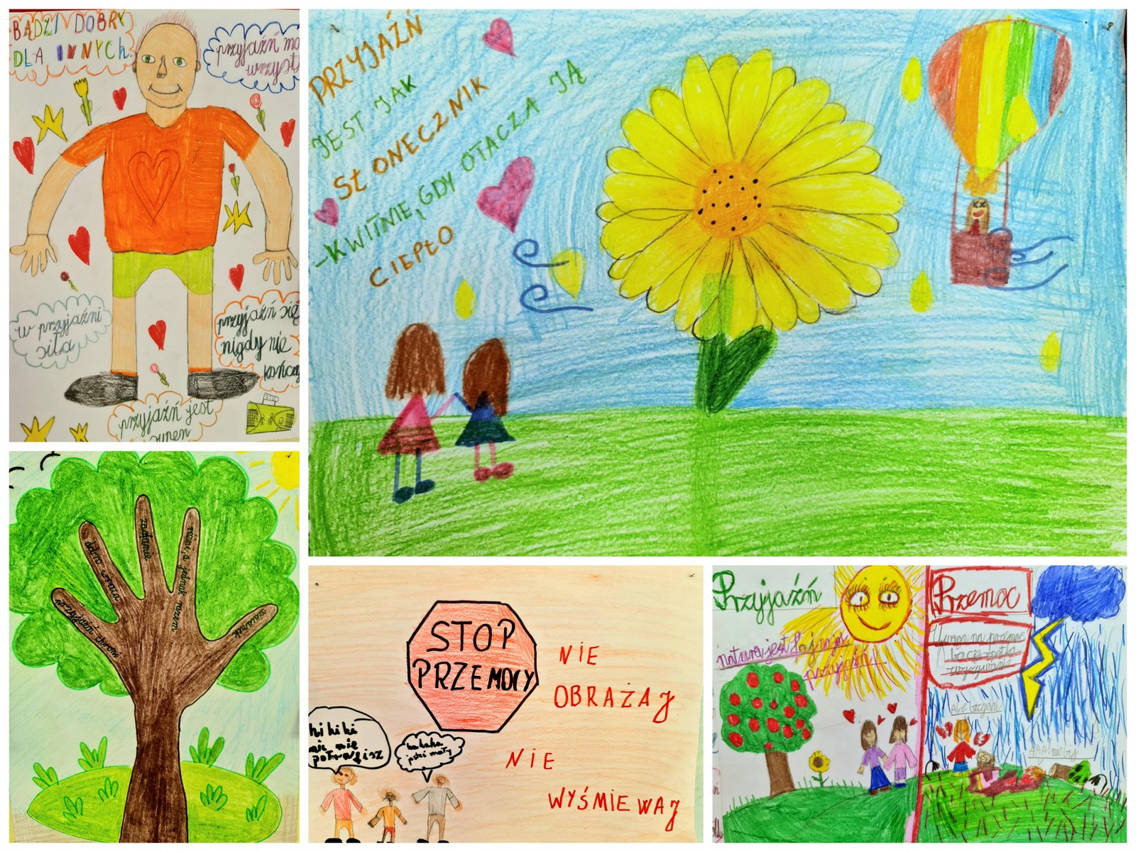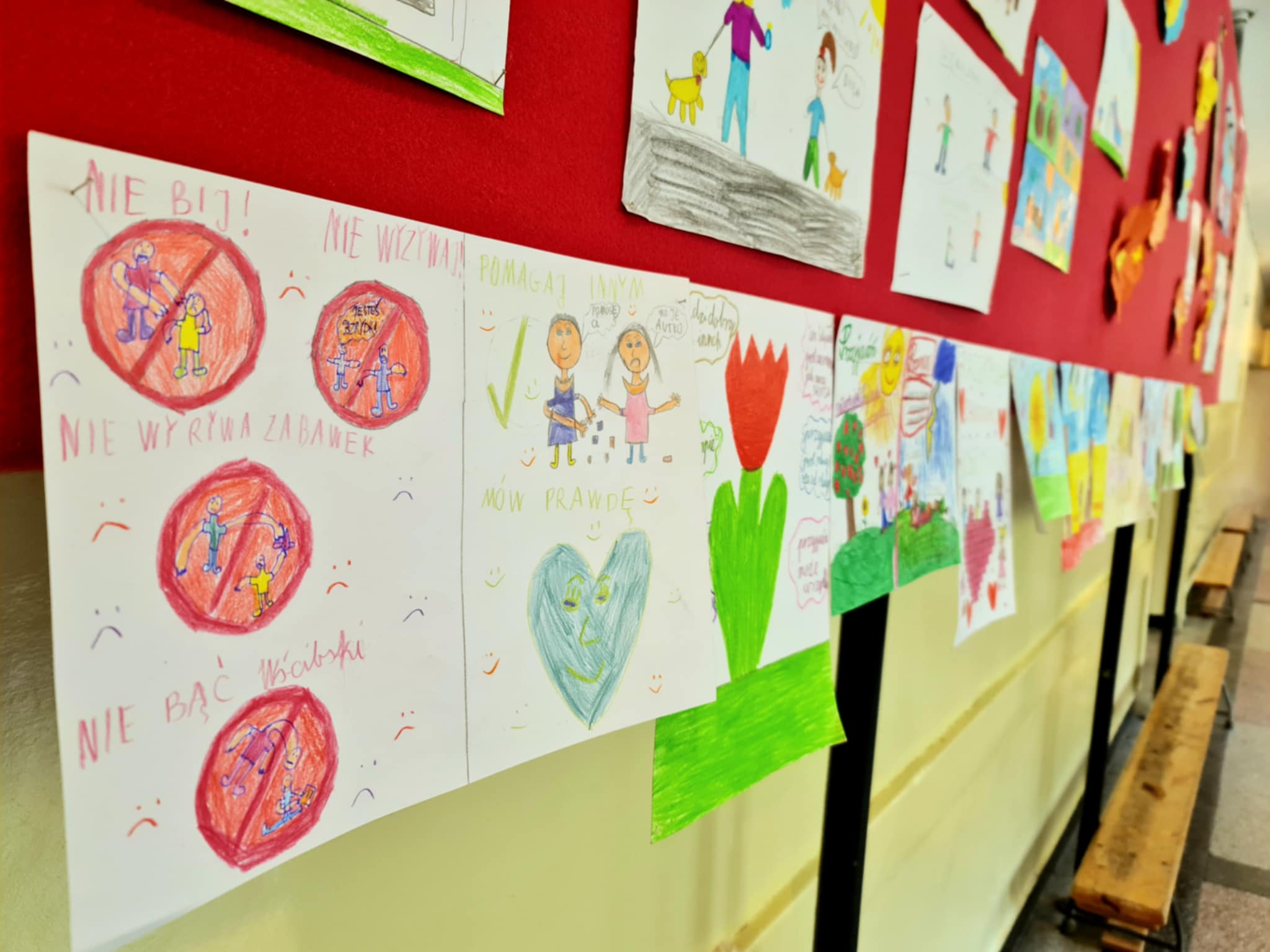 W klasach I–III odbyły się pogadanki z wychowawcami oraz warsztaty prowadzone przez psychologa szkolnego p. Paulinę Wardęcką. Uczniowie rozmawiali o różnych formach przemocy, sposobach reagowania i szukania pomocy, a także o przyjaźni i budowaniu dobrych relacji. Wykonali również piękne prace plastyczne związane z tą tematyką.