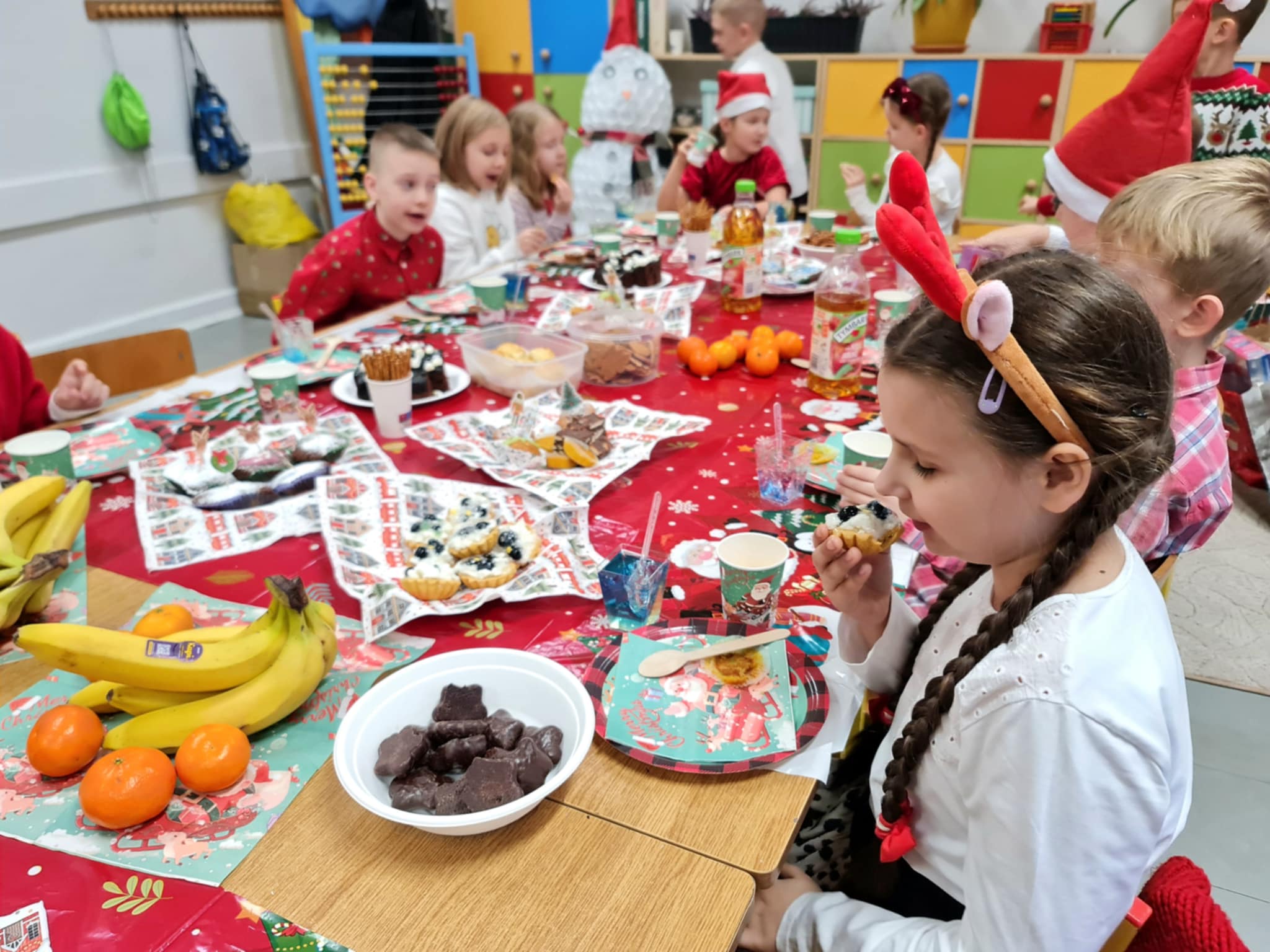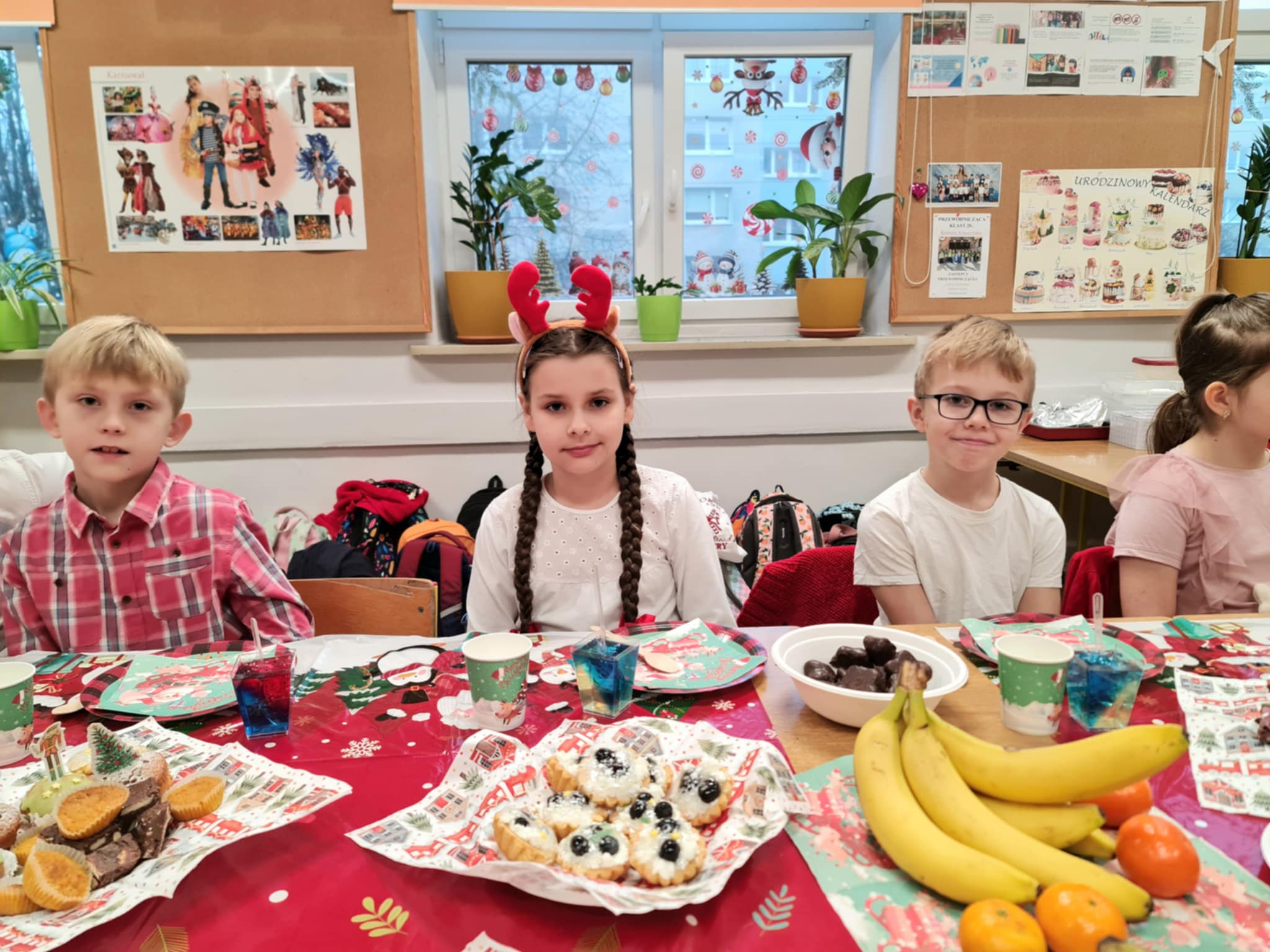 Następnie uczniowie zasiedli przy pięknie udekorowanym stole(podziękowania dla p. Adrianny Dudzik i p. Aleksandry Pecyny), na którym nie zabrakło świątecznych słodkości. Wspólne biesiadowanie było doskonałą okazją do rozmów i integracji.