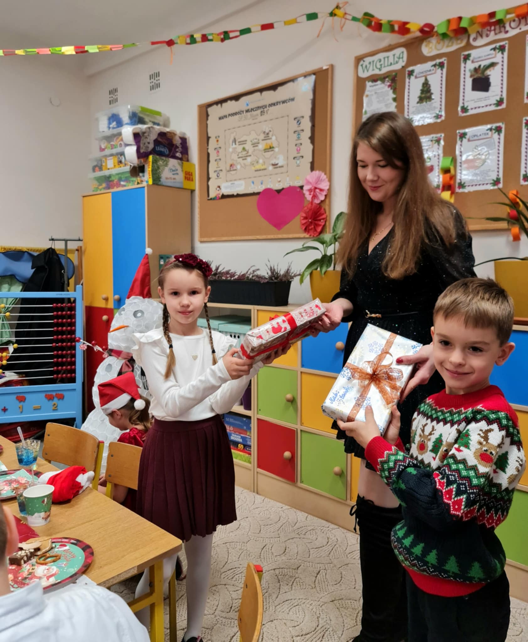 Kolejnym punktem spotkania było rozpakowywanie prezentów, które sprawiły dzieciom ogromną radość. Upominki szybko stały się inspiracją do wspólnej zabawy i wywołały wiele uśmiechów.